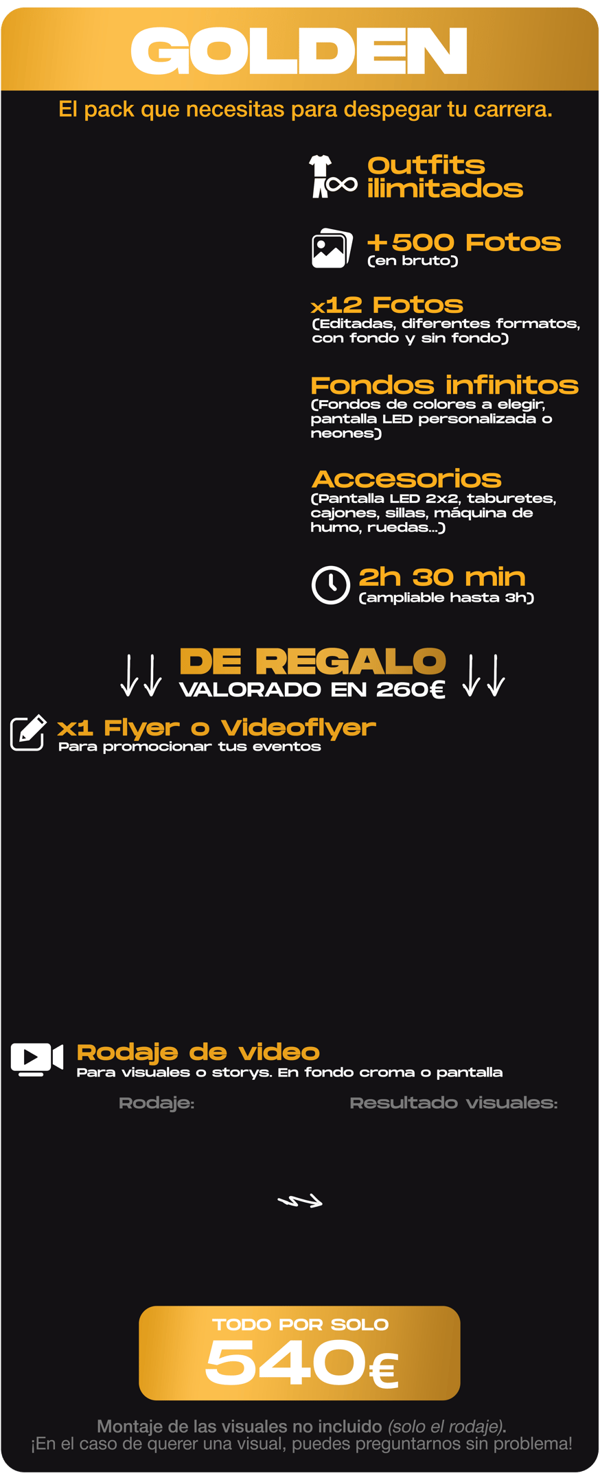 Si quieres captar la atención de discotecas, marcas y promotoras entonces el Pack GOLDEN es para ti: es el más completo y creativo.